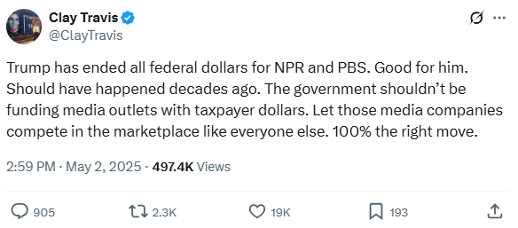 Trump has ended all federal dollars for NPR and PBS. Good for him. Should have happened decades ago. The government shouldn’t be funding media outlets with taxpayer dollars. Let those media companies compete in the marketplace like everyone else. 100% the right move.