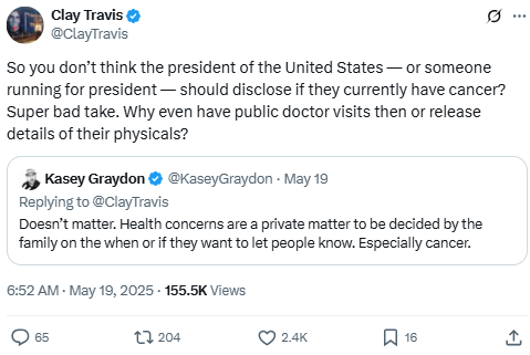 So you don’t think the president of the United States — or someone running for president — should disclose if they currently have cancer? Super bad take. Why even have public doctor visits then or release details of their physicals?