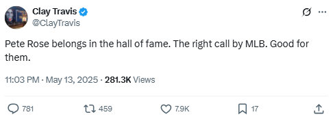 Travis supported Major League Baseball’s decision to posthumously reinstate Pete Rose into the Hall of Fame. He praised the move as a correction of a long-standing controversy tied to Rose’s lifetime ban over gambling.