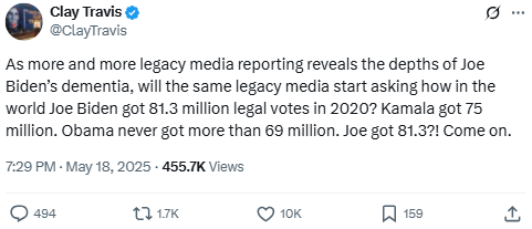 As more and more legacy media reporting reveals the depths of Joe Biden’s dementia, will the same legacy media start asking how in the world Joe Biden got 81.3 million legal votes in 2020? Kamala got 75 million. Obama never got more than 69 million. Joe got 81.3?! Come on.