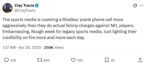 The sports media is covering a Shedeur prank phone call more aggressively than they do actual felony charges against NFL players. Embarrassing. Rough week for legacy sports media. Just lighting their credibility on fire more and more each day.