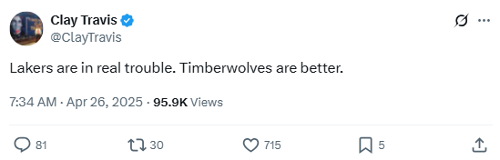 Clay reacted to the Lakers’ early exit from the NBA playoffs after being defeated 4-1 by the Timberwolves. Anthony Edwards led the charge for Minnesota, exposing Los Angeles’ late-game weaknesses and aging roster. The post echoed broader discussions on the Lakers’ decline and NBA star power.
