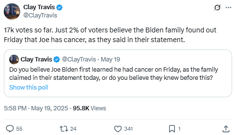 Travis shared poll results showing that only 2% of respondents believed the White House’s official timeline regarding Biden’s cancer diagnosis, reinforcing public distrust.