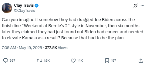 Can you imagine if somehow they had dragged Joe Biden across the finish line “Weekend at Bernie’s 2” style in November, then six months later they claimed they had just found out Biden had cancer and needed to elevate Kamala as a result? Because that had to be the plan.