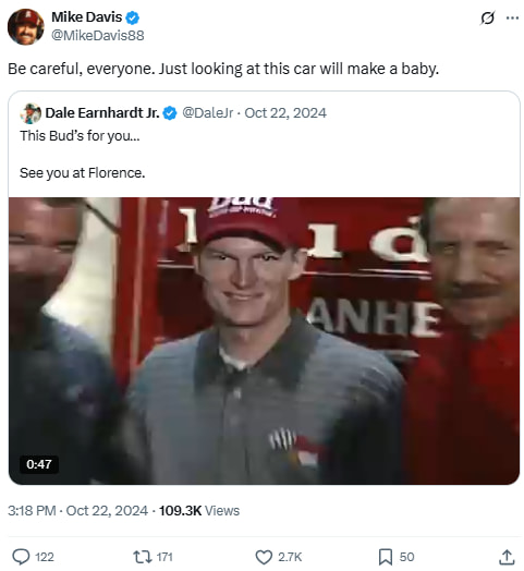 In a quote tweet of Dale Jr.’s throwback Budweiser car, Davis jokes about its appeal while nodding to the nostalgia of an iconic era in NASCAR history.