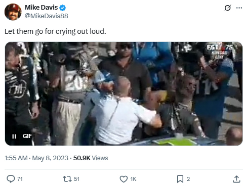 Reacting to the altercation between Noah Gragson and Ross Chastain, Davis posts a GIF urging officials to let them fight. His tweet captures ongoing debates about policing driver conflicts versus letting them settle things themselves.