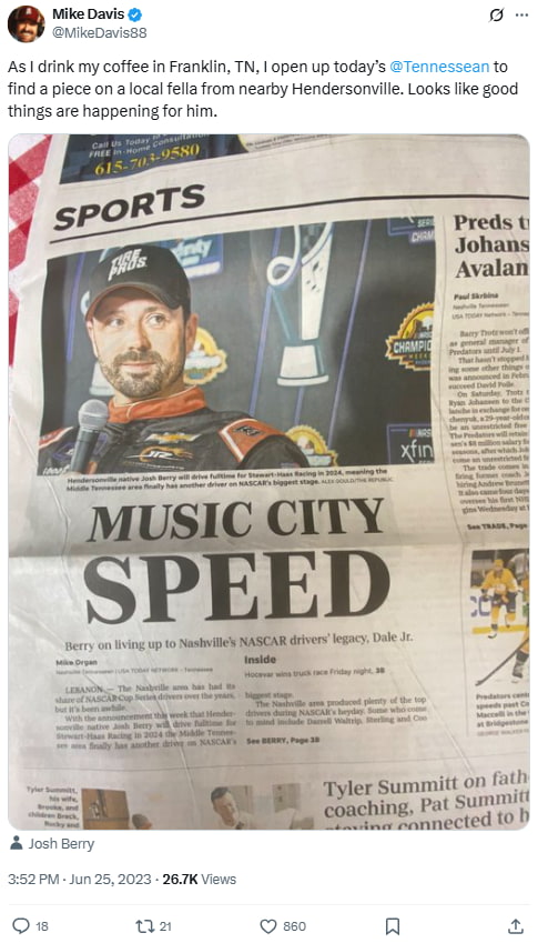 Davis shares pride in Josh Berry being featured in The Tennessean as Berry rises through the ranks of NASCAR, representing Middle Tennessee on a national level.