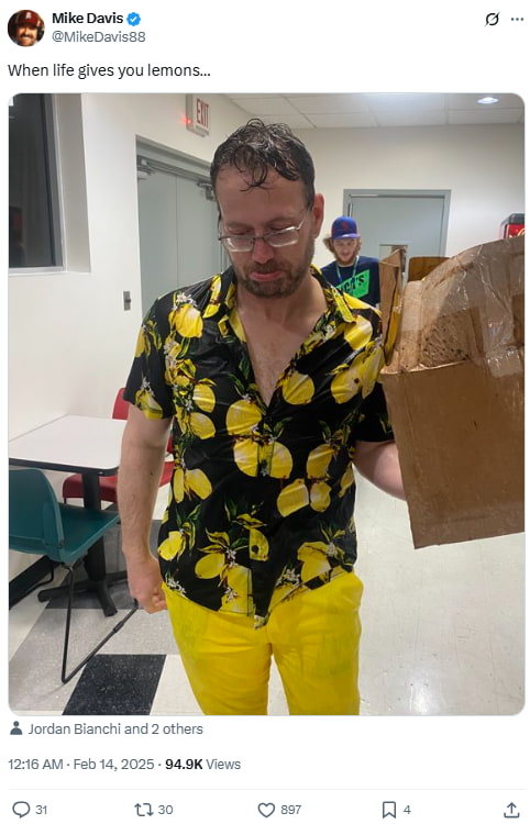 Accompanied by a photo of a man in a lemon-print shirt and yellow pants, Davis leans into visual humor, turning a fashion mishap into a relatable life metaphor.