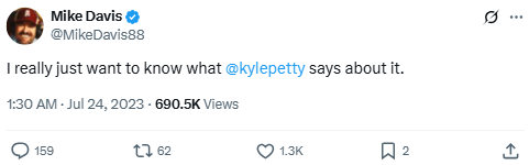 Davis cryptically references Kyle Petty, a former NASCAR driver known for strong opinions. The tweet hints at a developing situation in NASCAR and fans await Petty’s reaction.