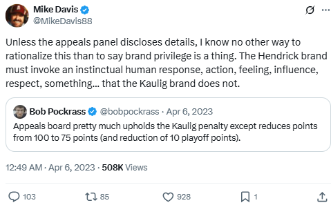 Unless the appeals panel discloses details, I know no other way to rationalize this than to say brand privilege is a thing. The Hendrick brand must invoke an instinctual human response, action, feeling, influence, respect, something… that the Kaulig brand does not.