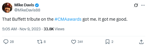 That Buffett tribute on the #CMAawards got me. It got me good.