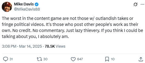 The worst in the content game are not those w/ outlandish takes or fringe political videos. It’s those who post other people’s work as their own. No credit. No commentary. Just lazy thievery. If you think I could be talking about you, I absolutely am.