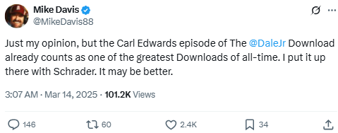 Mike Davis praises the Dale Jr. Download featuring Carl Edwards, calling it one of the best episodes ever. Edwards’ emotional stories and reflections, including his abrupt 2017 retirement after a controversial caution cost him a potential championship, struck a chord with fans and placed the episode alongside the beloved Ken Schrader interview.