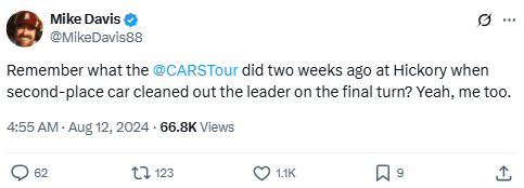 Remember what the @CARSTour did two weeks ago at Hickory when second-place car cleaned out the leader on the final turn? Yeah, me too.