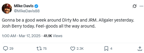 Gonna be a good week around Dirty Mo and JRM. Allgaier yesterday. Josh Berry today. Feel-goods all the way around.