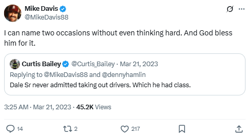 In response to a claim that Dale Earnhardt Sr. never took out drivers intentionally, Davis references two well-known incidents, including the 1999 Bristol race, to argue the opposite. His tweet adds humor and admiration while acknowledging Earnhardt’s aggressive reputation.
