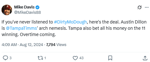 Promoting a Dirty Mo betting podcast, Davis jokes about the friendly rivalry between Tampa Timms and Austin Dillon following a dramatic overtime NASCAR finish.