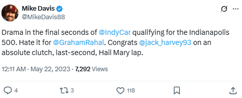 Drama in the final seconds of @IndyCar qualifying for the Indianapolis 500. Hate it for @GrahamRahal. Congrats @jack_harvey93 on an absolute clutch, last-second, Hail Mary lap.