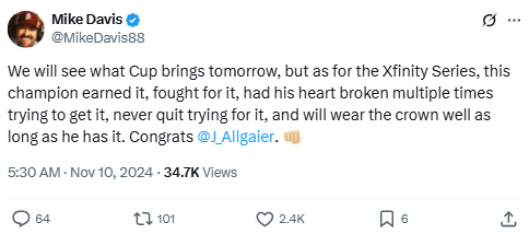 Davis congratulates Justin Allgaier on finally winning the 2024 Xfinity Series championship after 471 races. His persistence through past disappointments, especially at Phoenix in 2023, made the win even more meaningful. The post recognizes not just victory, but the struggle behind it.