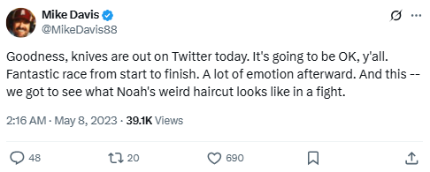 Goodness, knives are out on Twitter today. It’s going to be OK, y’all. Fantastic race from start to finish. A lot of emotion afterward. And this — we got to see what Noah’s weird haircut looks like in a fight.