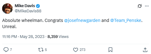 Davis congratulates Josef Newgarden and Team Penske on winning the 2023 Indy 500, praising Newgarden’s skill after a dramatic final-lap victory.