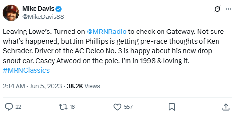 Leaving Lowe’s. Turned on @MRNRadio to check on Gateway. Not sure what’s happened, but Jim Phillips is getting pre-race thoughts of Ken Schrader. Driver of the AC Delco No. 3 is happy about his new drop-snout car. Casey Atwood on the pole. I’m in 1998 & loving it.