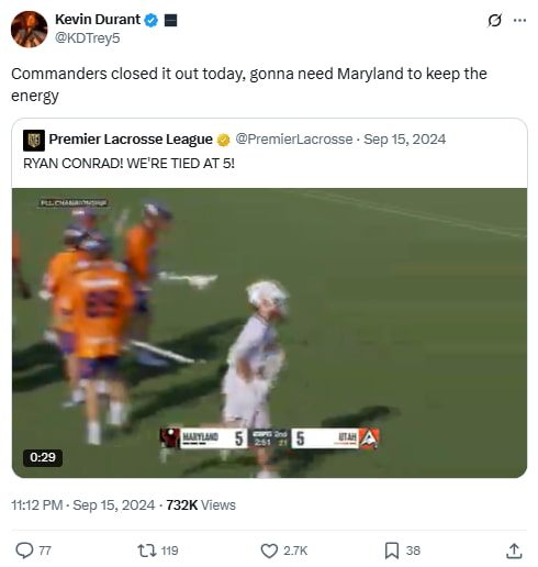Durant ties two sports together here—celebrating the Washington Commanders’ win while hoping the Maryland lacrosse team brings the same energy. As an investor in the Premier Lacrosse League, Durant shows he’s deeply plugged into more than just basketball.