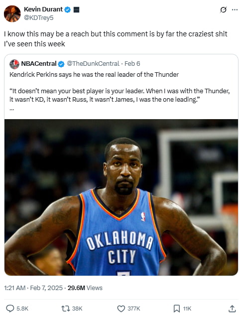 Durant roasts Kendrick Perkins’ claim that he—not KD, Westbrook, or Harden—was the true leader of the OKC Thunder. With millions of views, this tweet sparked a huge debate among fans and media.