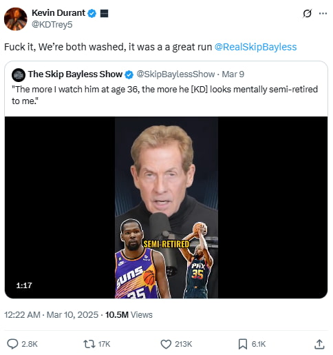 Durant responds to Skip Bayless, who claimed KD looks “mentally semi-retired.” With humor and shade, Durant not only accepts the jab but reflects it back, questioning Bayless’s own relevance. It came right after Durant dropped solid numbers in a Suns win, proving he’s far from done.