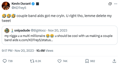 In a lighthearted exchange, Durant responds to a fan joking about his earlier betting-related complaints. The term “couple band aids” refers to small betting profits. Durant laughs it off and shows self-awareness, highlighting how fan-athlete interactions over betting have become a regular (and sometimes tense) part of his online presence.