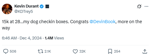 Durant congratulates Devin Booker for hitting 15,000 points at age 28. It’s all love and admiration for a teammate who keeps grinding and reaching milestones.