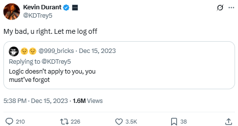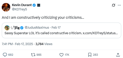 Durant responds to criticism in a thread defending his training habits. When a fan sarcastically claims logic doesn’t apply to him, Durant fires back in his usual tone. The post nods to his reputation for arguing online and reflects his ongoing sensitivity to fan criticism, even joking about logging off to end the exchange.