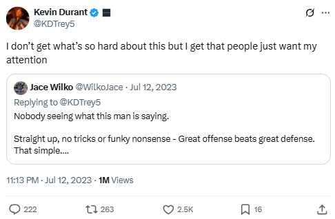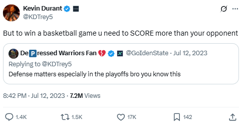 Durant continues defending his take that offense wins games. The quote is a follow-up to an earlier debate on scoring versus defense, showing his willingness to engage fans directly.