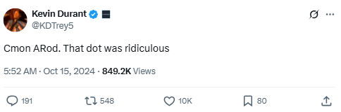Durant’s NFL fandom shines again, this time giving props to Aaron Rodgers for a perfect pass. Calling it a “dot,” he salutes the quarterback’s precision—even in a game the Jets lost.