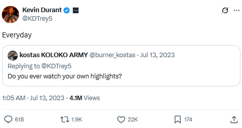 When asked if he watches his own highlights, Durant answers bluntly. The post reveals his routine of self-review and commitment to improvement through watching film.