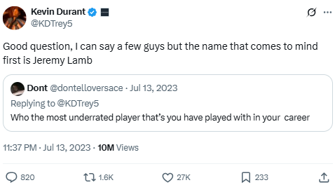 Durant names Jeremy Lamb the most underrated player he’s teamed with, during a fan Q&A. His answer drew both agreement and debate over Lamb’s career impact.