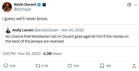 Durant replies to a viral take about a foul called on him during a Suns-Jazz double-overtime game. The debate over whether the call would have gone differently with names reversed sparked further commentary on NBA officiating inconsistencies. Durant’s cryptic line references a Kanye lyric, keeping things subtle but firm.