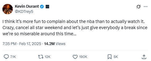 This was Durant’s dry-witted clapback to a fan defending complaints about the All-Star Game. It reflects his ongoing frustration with how fans and commentators pick apart every league event.