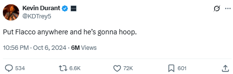 KD praises NFL quarterback Joe Flacco in basketball terms, causing a stir. He blurs sports language to celebrate Flacco’s clutch play with the Colts, and fans loved (and debated) the crossover.