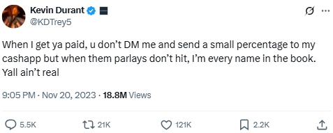 KD vents about the double standard he faces from sports bettors. Fans cheer when he helps them win but blame him when he doesn’t. The tweet touches on the increasing tension between athletes and the betting community in an era where player performance directly impacts financial outcomes.