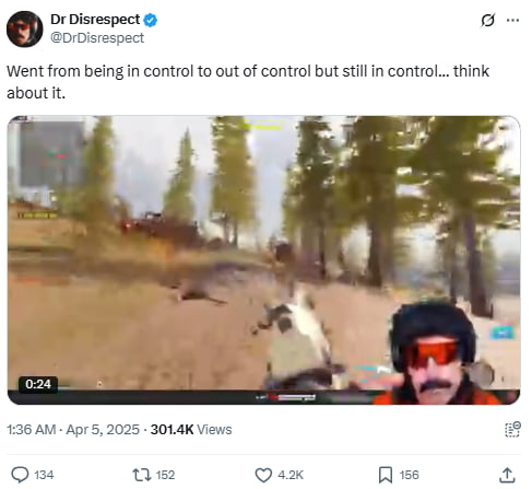 This post shows gameplay from Call of Duty: Warzone, where Dr. Disrespect loses control of a vehicle but continues playing confidently. The message plays into his chaotic but calculated image, aligning with his brand of intense, unpredictable content.