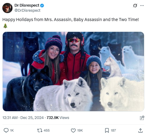 This holiday card features Dr. Disrespect with his family and digitally added wolves. The post blends sincerity with theatrical flair, typical of his online persona.