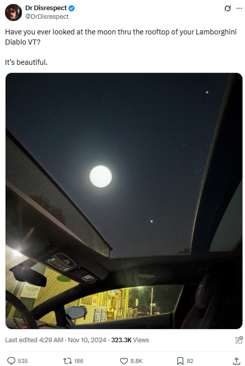 A poetic yet flex-filled moment, this post shows a full moon framed by the roof of a rare sports car. It’s pure Dr. Disrespect: nostalgic, boastful, and oddly sincere.