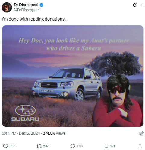 Dr. Disrespect shares a vintage-style meme tying himself to a Subaru stereotype, referencing a long-standing cultural joke about the car brand’s associations. The tweet blends absurdity with tongue-in-cheek humor, while his caption expresses mock frustration with repetitive fan donations.