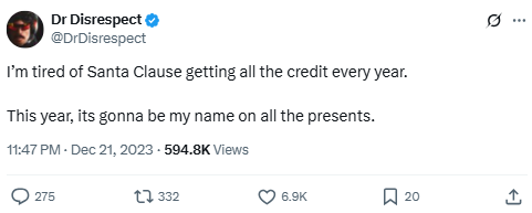 Dr. Disrespect jokingly takes aim at Santa Claus, demanding the spotlight for holiday gifts. The tweet aligns with his competitive, self-aggrandizing persona, turning even Christmas into a branding moment.