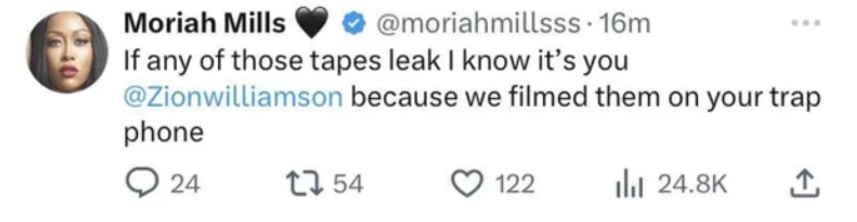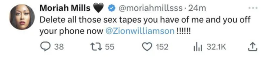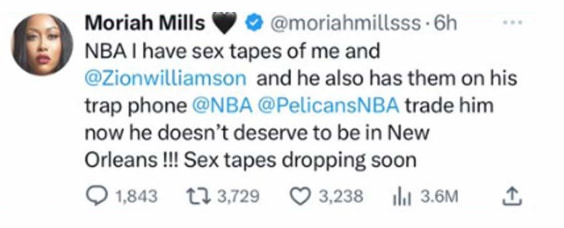Mills escalated things by threatening to release sex tapes unless Zion was traded, leading to her Twitter account’s suspension.