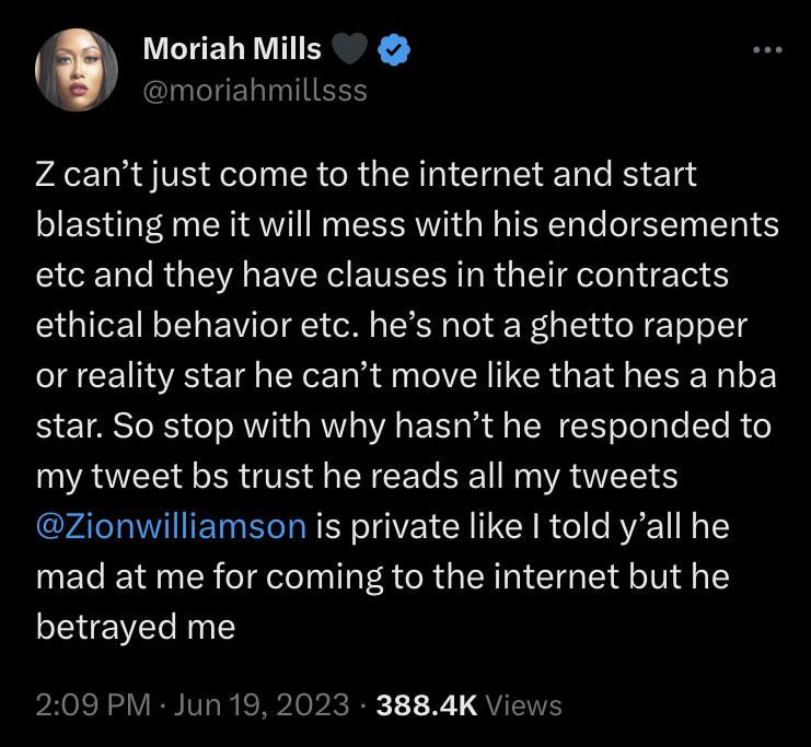 “Z can’t just come to the internet and start blasting me it will mess with his endorsements etc and they have clauses in their contracts ethical behavior etc. he’s not a ghetto rapper or reality star he can’t move like that hes a nba star. So stop with why hasn’t he responded to my tweet bs trust he reads all my tweets @Zionwilliamson is private like I told y’all he mad at me for coming to the internet but he betrayed me”