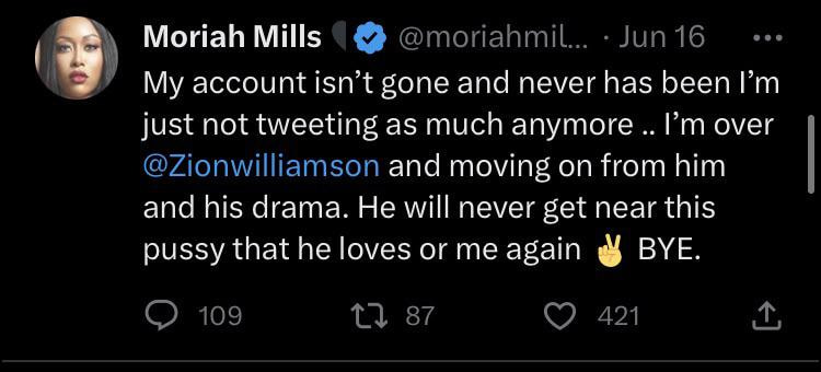 “My account isn’t gone and never has been I’m just not tweeting as much anymore .. I’m over @Zionwilliamson and moving on from him and his drama. He will never get near this pussy that he loves or me again ✌️BYE.”