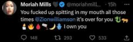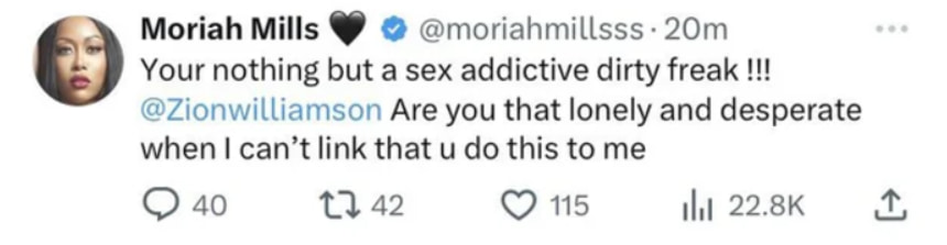 “Your nothing but a sex addictive dirty freak !!! @Zionwilliamson Are you that lonely and desperate when I can’t link that u do this to me”