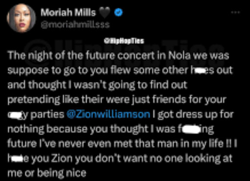 “The night of the future concert in Nola we was suppose to go to you flew some other hs out and thought I wasn’t going to find out pretending like their were just friends for your 🧃 parties @Zionwilliamson I got dress up for nothing because you thought I was fing future I’ve never even met that man in my life !! I hate you Zion you don’t want no one looking at me or being nice”